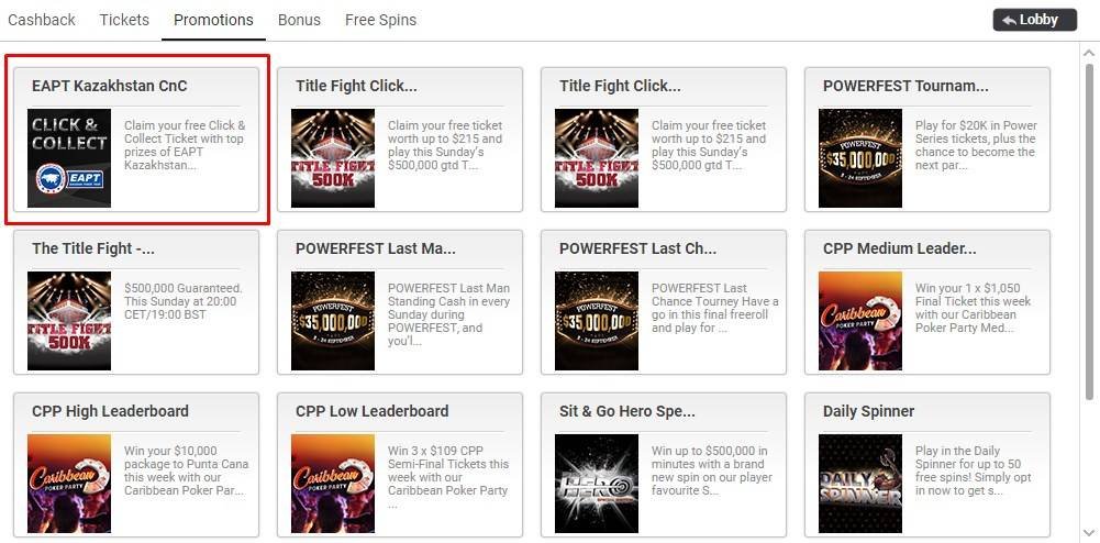 На partypoker проходит акция Click & Collect, в которой игроки бесплатно получают билеты на отборочные сателлиты к Главному событию. А если повезет, то и сам бай-ин. Билеты раздаются случайным образом, стоимостью от $1,1 до $1,100.
