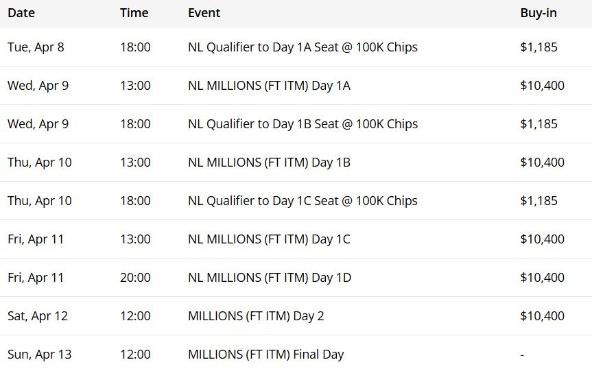 Бай-ин ивента $10,400 долларов — четыре флайта первого дня с 9 по 11 апреля. Каждый флайт длится восемь уровней, а поздняя регистрация в течение 12 уровней с неограниченным количеством повторных входов.