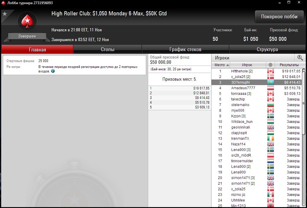 Сначала “3DTemujiN” записал в свой послужной список финалку Monday 6-Max с бай-ином $1,050 и гарантией $50К.