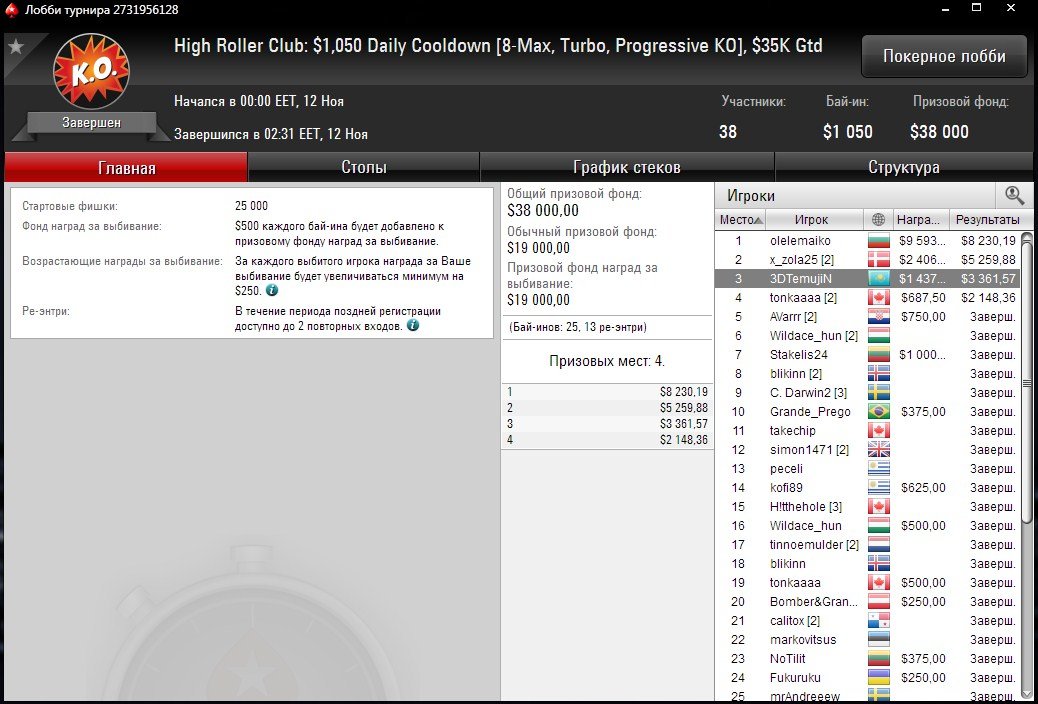 Ранее “3DTemujiN” выиграл $22К в турнирах Хайроллеров.