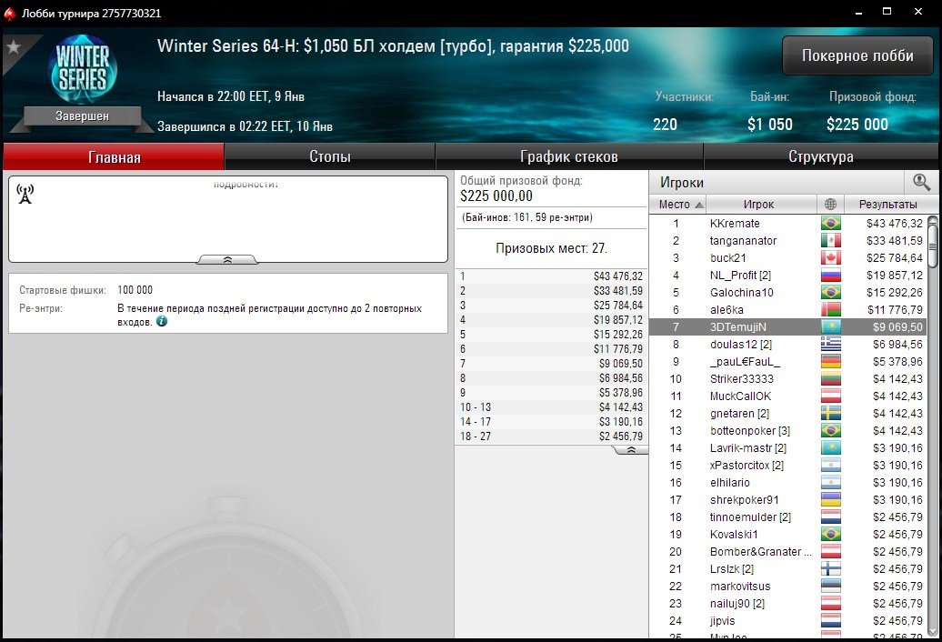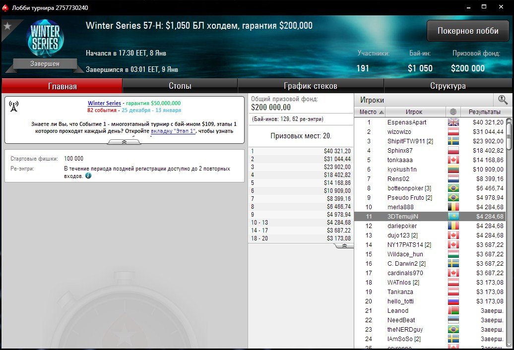 Сначала “3DTemujiN” вошел в ИТМ в турнире Winter Series за $1,050. В ивенте был сделан 191 вход, в том числе 62 ре-энтри.
