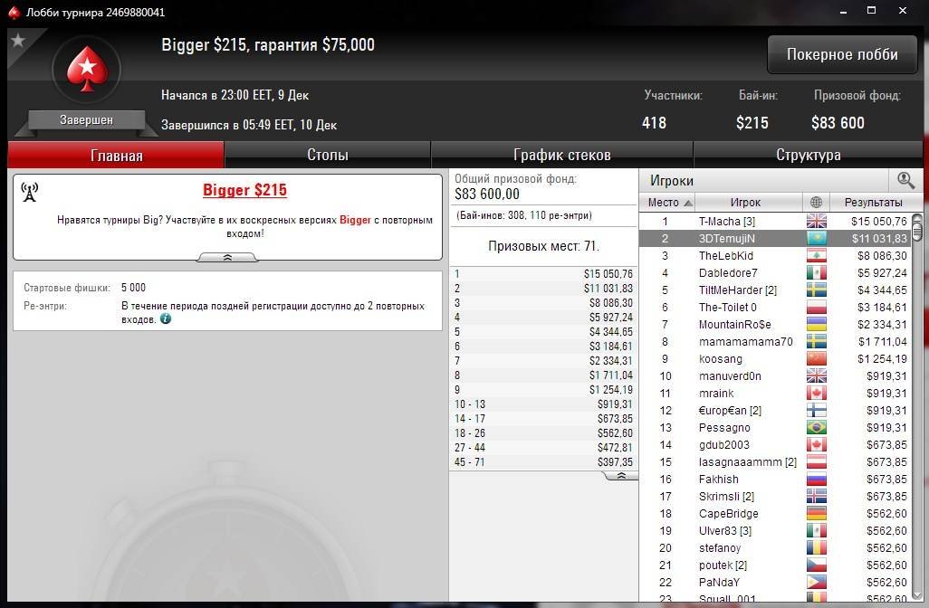 И наконец, лучший результат в течение недели – топ-2 в Bigger с бай-ином $215. Турнир привлек 418 входов, благодаря чему призовой фонд составил $84К. “3DTemujiN” остановился всего в шаге от заветного первого места и выиграл $11,031.
