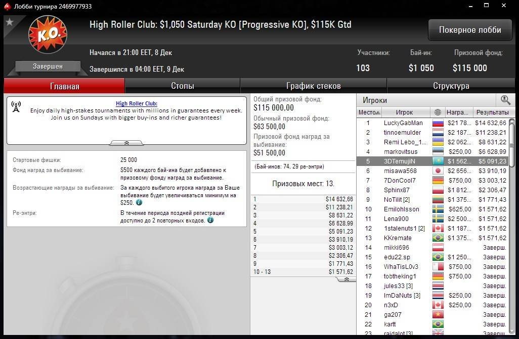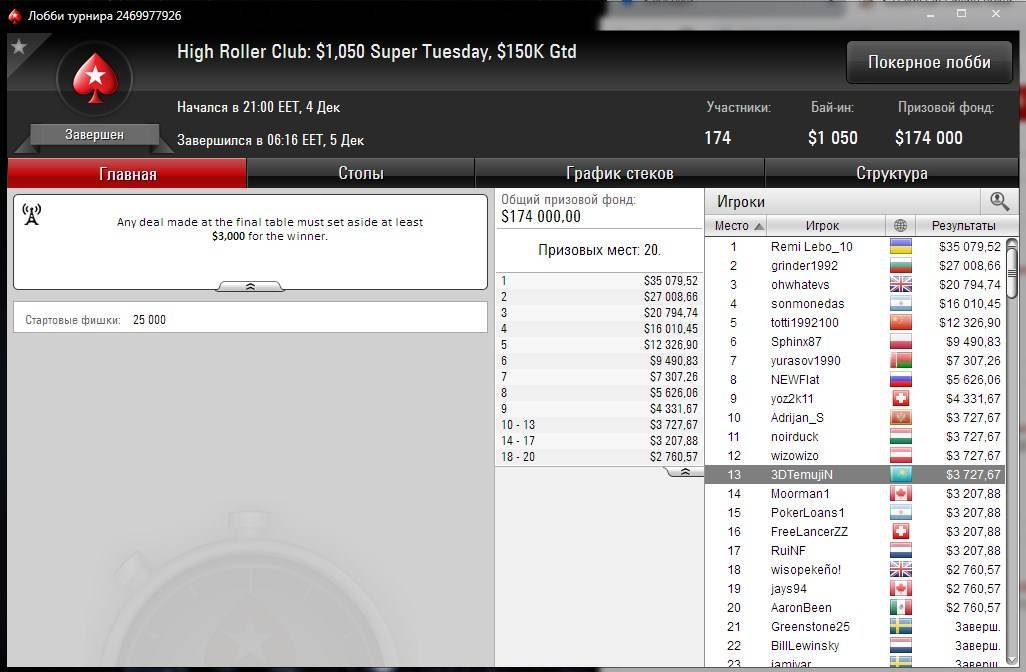 На следующий день “3DTemujiN” уже трижды попал в призы в дорогих турнирах PokerStars High Roller Club. Сначала он выиграл $1,355 за 9 место в ивенте по омахе $530 Omania HR [6-Max], гарантия которого составляла $30K. Затем он оформил 11 место в $530 Daily 500, получив $1,482. И в завершении наш соотечественник занял 13 место в Super Tuesday с бай-ином $1,050 и гарантом $150K. Его приз составил $3,727.