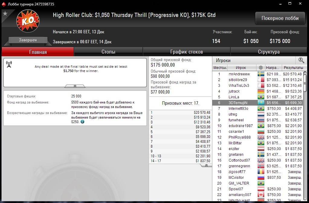 13 декабря “3DTemujiN” показал лучший результат за неделю – второе место в дорогом турбо $1,050 Daily Cooldown с прогрессивными нокаутами. В ивенте было сделано 95 регистраций.
