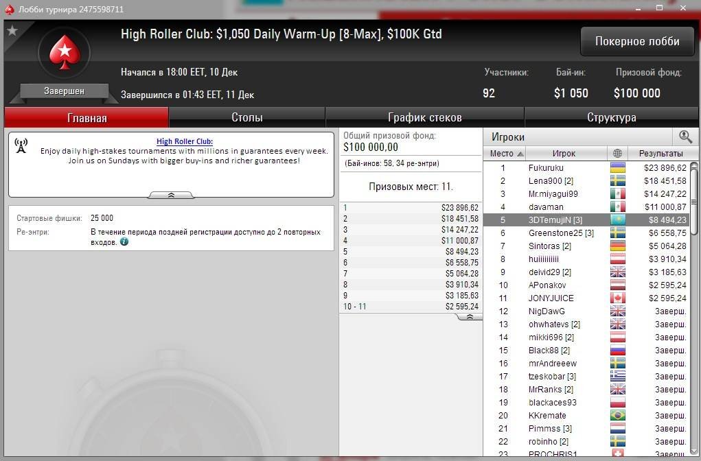 Шынгыс “3DTemujiN” начал зарабатывать в High Roller Club на PokerStars с турнира Daily Warm-Up [8-Max] с бай-ином $1,050. Событие с 92 входами прошло с небольшим оверлеем, так что гарантия в $100K осталась неизменной.