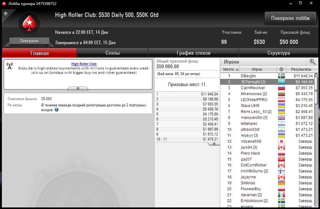И завершил неделю “3DTemujiN” отличным выступлением в Daily 500 с бай-ином $530 и гарантией $100К. В турнире было сделано 99 входов, а призовые выплаты начинались с 11 места в размере $1,5К.