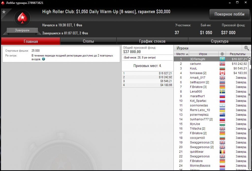 В турнире приняло участие 28 игроков, сделавших ещё 9 повторных входов. Призовых мест было всего 4.