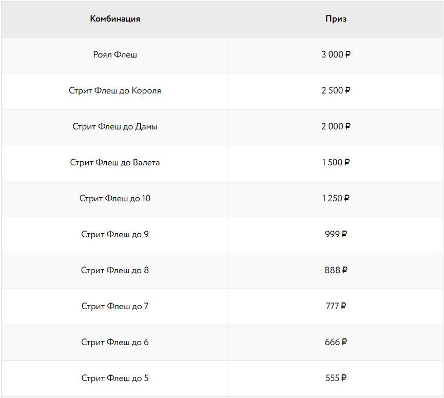 За каждую собранную комбинацию за кэш-столами Техаского Холдема от 5/10 ₽ ты будешь получать мгновенный денежный приз