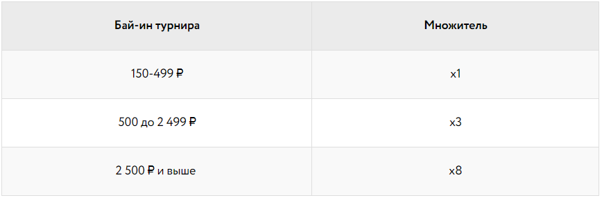 Очки будут зачисляться за ТОП-10 призовые места в турнире и умножаться на коэффициент сложности в зависимости от бай-ина турнира.