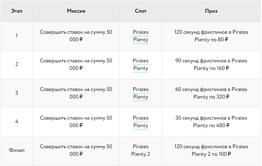 Просто заходи в новый слот Pirates Plenty и начинай выполнять первую миссию. После её завершение произойдет автоматическая активация второго задания, после завершения второго — третье, и так далее, вплоть до финала.