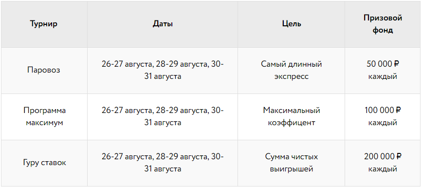В турнирах участвуют все виды и типы ставок, сделанные на исходы спортивных событий, в которых не была использована функция «Cash Out».
