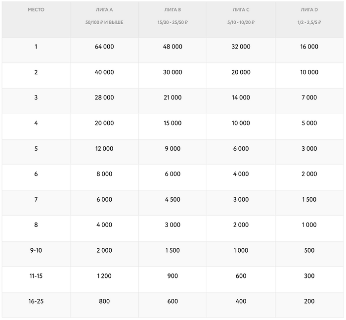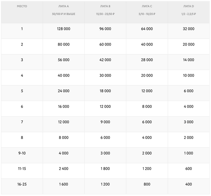 • Лига A (лимиты 50/100 рублей и выше) – призовой фонд 215 000 рублей;