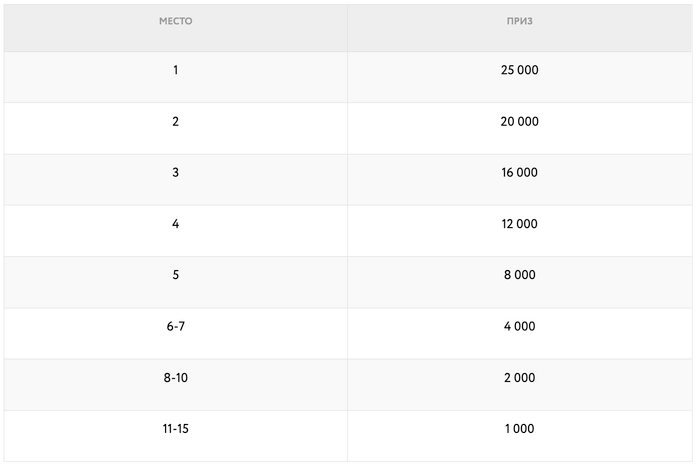 С 25 июля по 18 сентября принимай участие в регулярных турнирах с бай-ином от 250 рублей и зарабатывай очки за нокауты оппонентов. Еженедельно мы будем подводить итоги и топ-15 игроков с наибольшим количеством очков будут забирать 100 000 рублей! Распределение призовых — в таблице ниже: