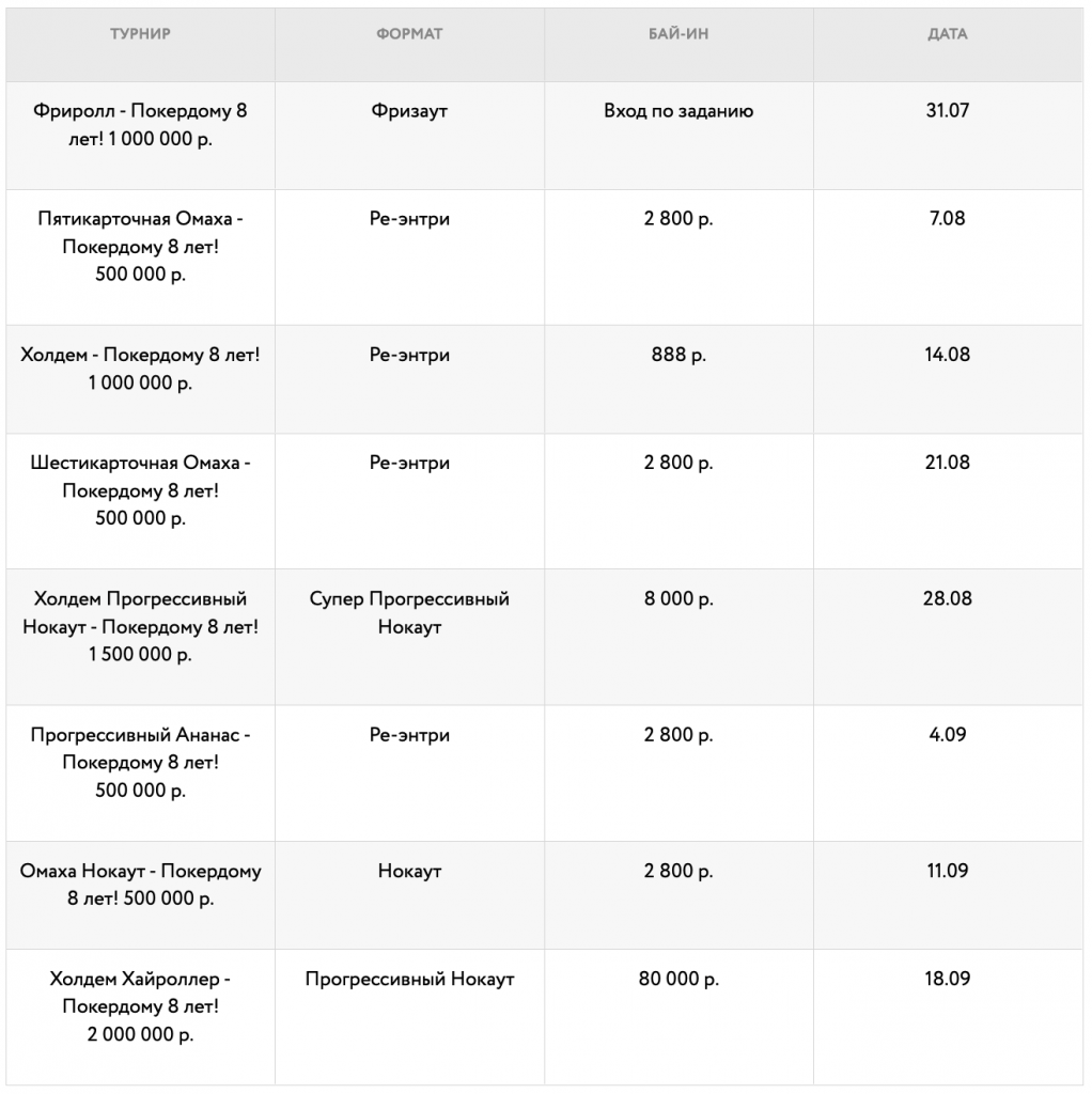 1. 8-летие Покердома пройдет с 22 июля по 18 сентября.