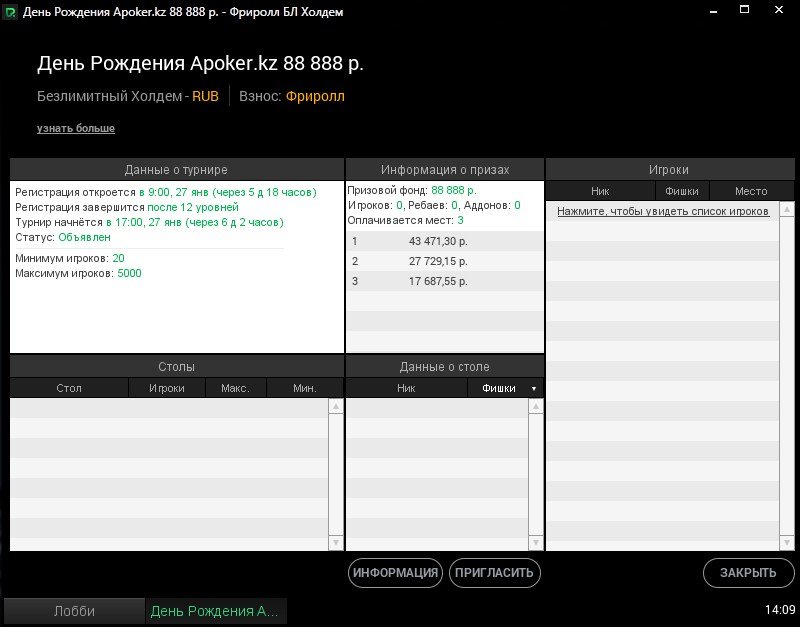 «День Рождения Apoker.kz» пройдет бесплатно, но с возможностью сделать ребаи и адд-он за 8,88 рублей.