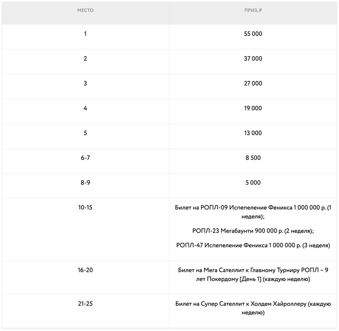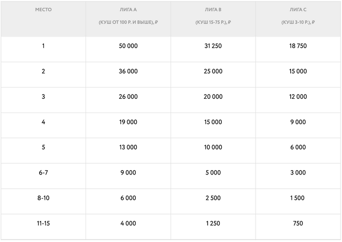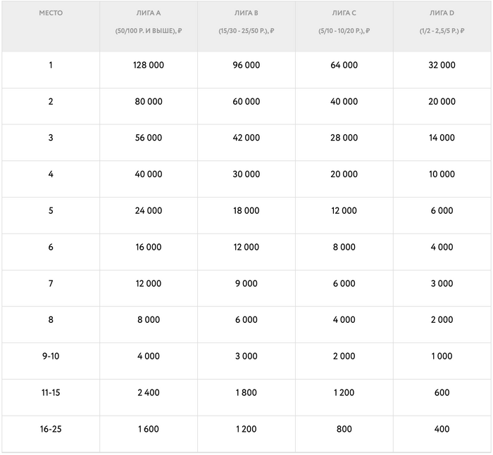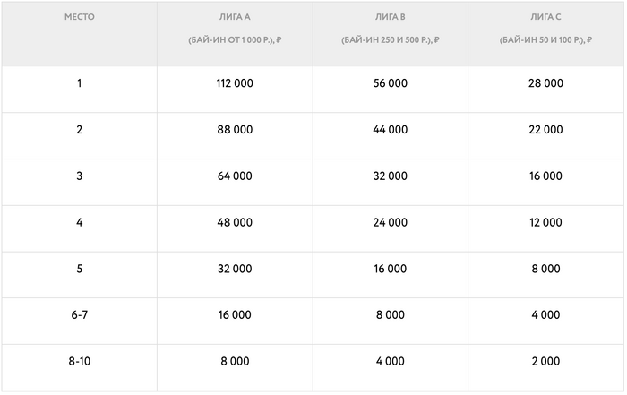 — Лига A (лимиты 25/50 рублей и выше) – призовой фонд 700 000 рублей;