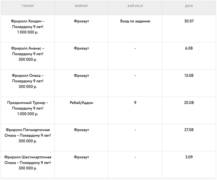 - Рейк-гонка по Пятикарточной, Шестикарточной, Семикарточной Омахе стартует с 28 июля 00:00 МСК и завершится 6 августа 23:59 МСК.