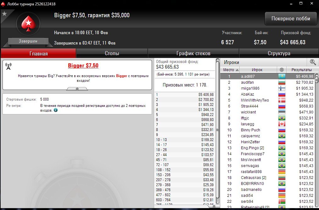 Турниры Биггер в воскресенье, как всегда, бывают самыми массовыми и собирают большие призовые фонды. Bigger с бай-ином $7,50, прошедший 10 февраля 2019-го, не стал исключением. В ивенте было сделано 6,527 входов, а гарантия в $35,000 была успешна побита до $43,665.
