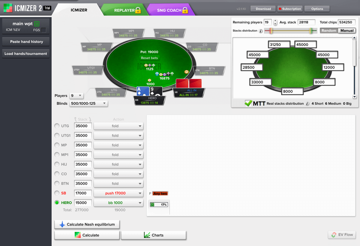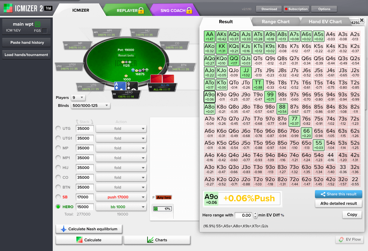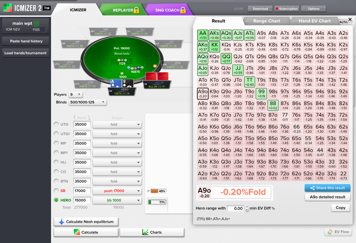 Александр «lamentcfg», используя покерную программу ICMIZER 2, которая выполняйте ICM расчеты с помощью префлоп калькулятора, разобрал одну их своих раздач и…