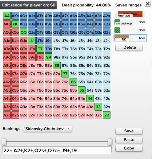первый сюрприз — по нешу мой оппонент, имеющий на 3 блайнда больше меня обязан с сб на бб запихивать в меня 100% своего диапазона
