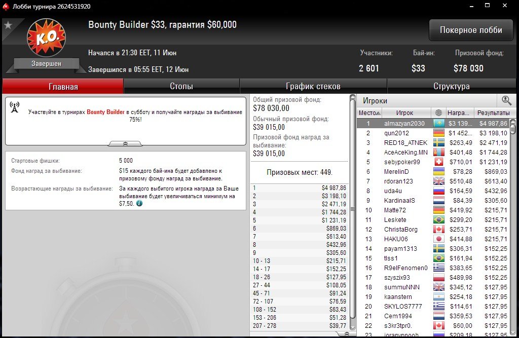 Bounty Builder прошел на PokerStars 11 июня с гарантией $60К.