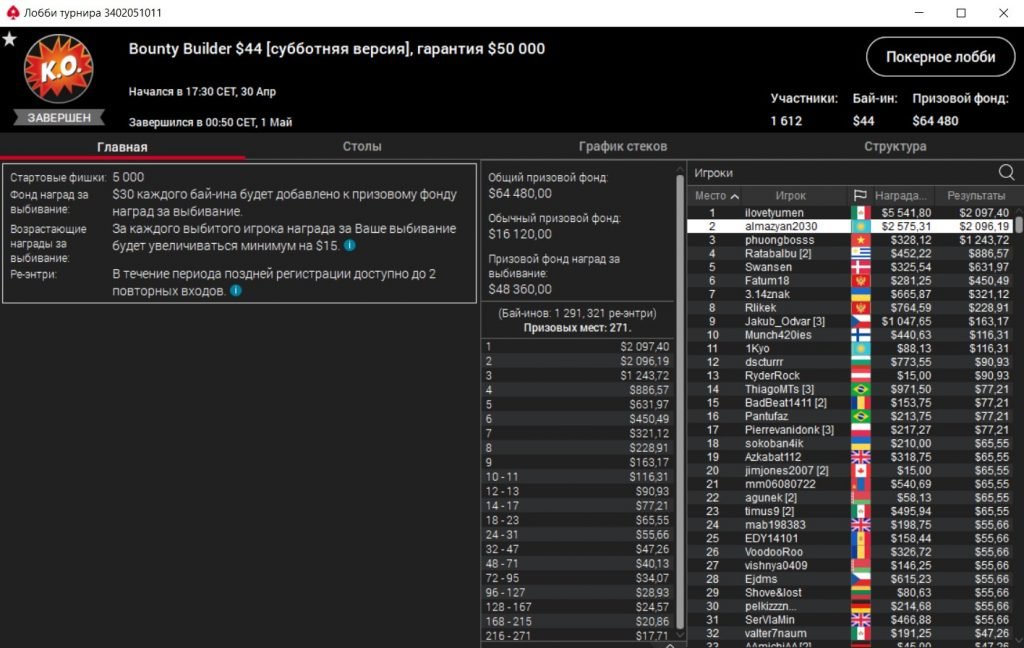 Покерист из Казахстана остановился на второй строчке в Баунти Билдере за $44 на PokerStars.