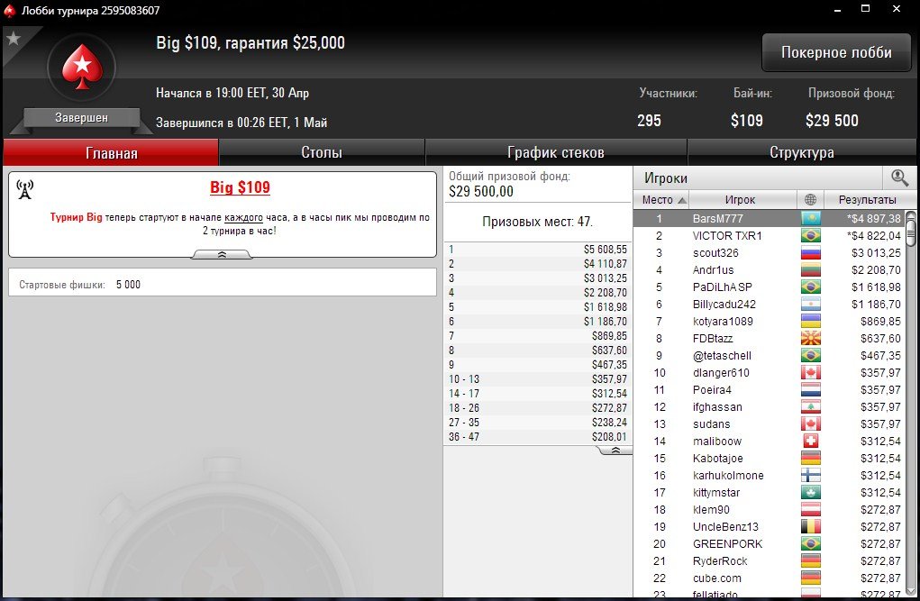 Форумчанин Борис “BarsM777” стал победителем турнира Big с бай-ином $109 на PokerStars.