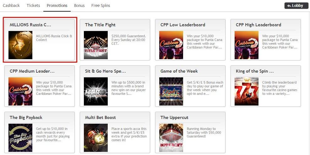 В покер-руме проходит уникальная акция Click and Collect, в которой ежедневно случайным образом выдаются совершенно бесплатно билеты на сателлиты. Акция расположена в лобби partypoker в одноименном разделе: