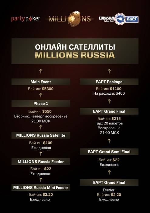 С 12 августа по 4 сентября на partypoker пройдут 8 фрироллов, гарантированный общий приз которых составит $6,000 в виде билетов на сателлиты MILLIONS Russia …