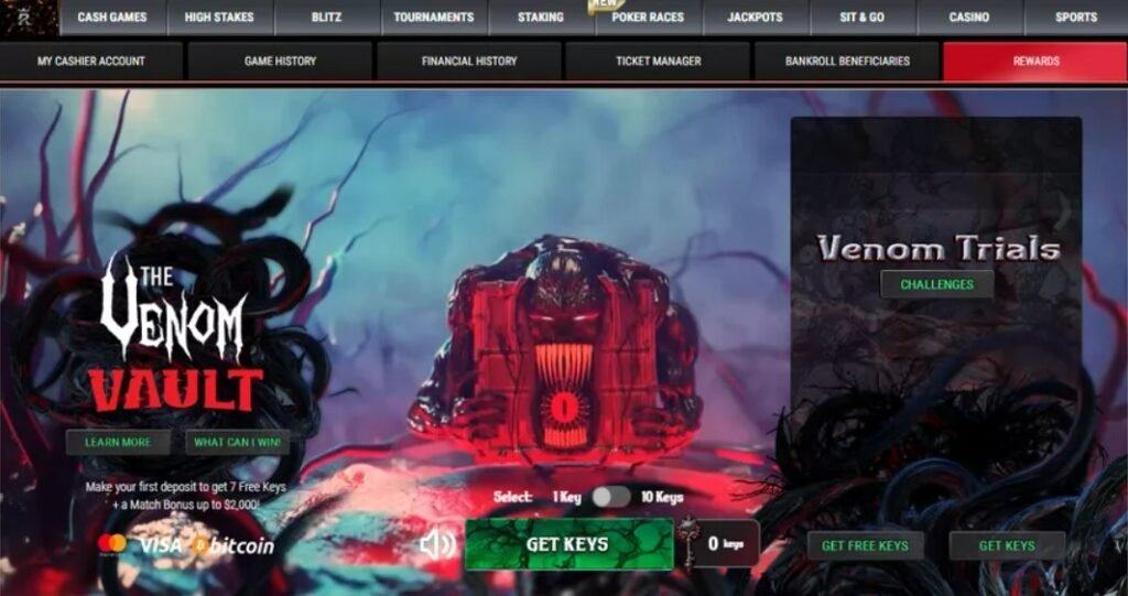 Раздел акции Venom Vault доступен в меню Rewards покерного клиента. Здесь игроки открывают призовые сундуки, используя специальные ключи.