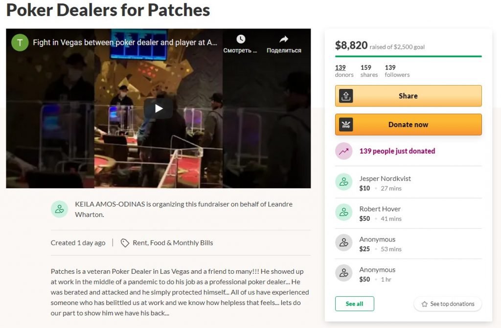 Из-за этой драки Патч потерял лицензию дилера и остался без работы. Но покерное сообщество – дилеры, кто лично его знал и просто неравнодушные игроки – решили собрать денежные средства Патчу в размере $2,500. На данный момент донаты уже превысили собираемую сумму более чем на $6 тысяч и продолжают поступать.