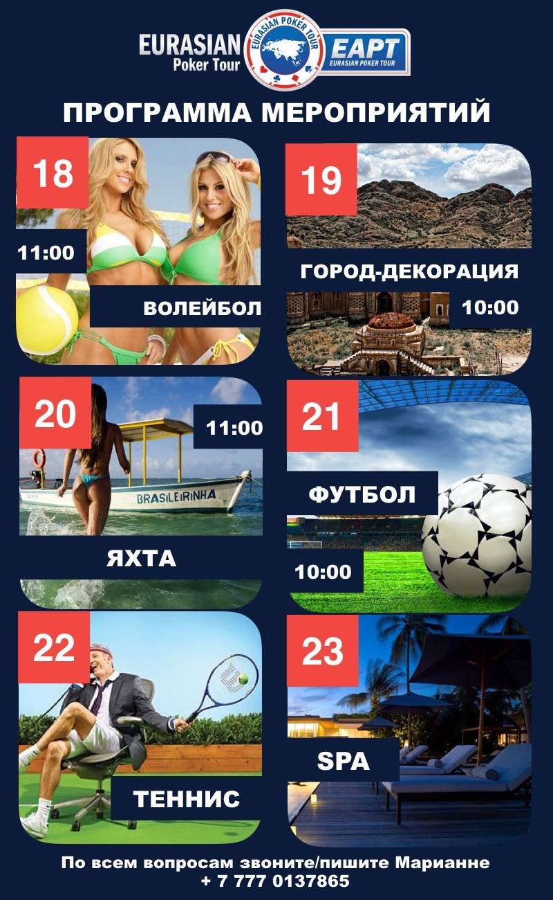 Мы уже сообщали о том, что организаторы Eurasian Poker Tour готовят массу развлечений для гостей серии. Вчера им удалось побывать в элитном клубном городке «Marine-Club», расположенного на побережье Капчагайского водохранилища. Именно на его территории и состоятся спортивные мероприятия, в программу которых войдет волейбол, футбол, теннис и др.
