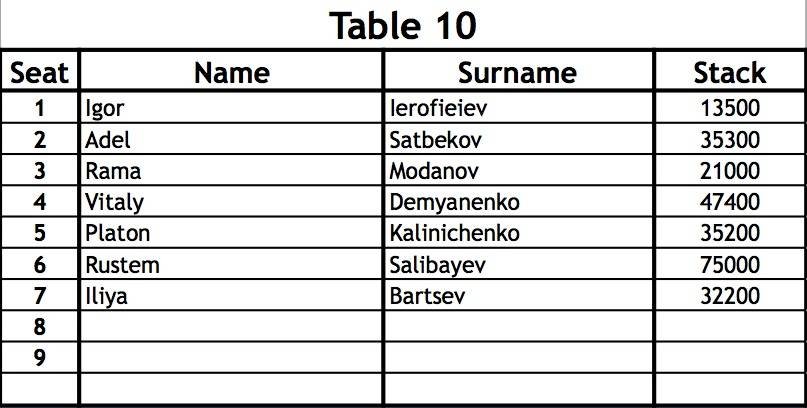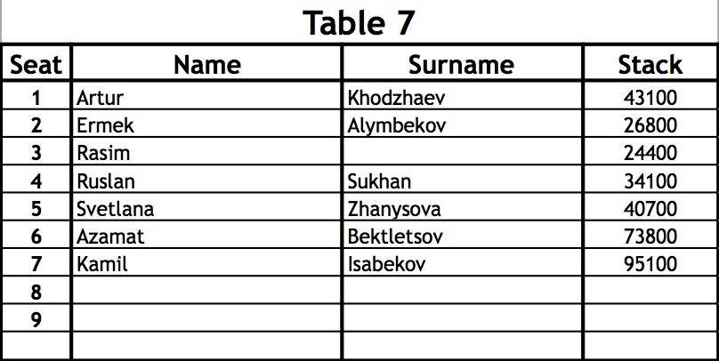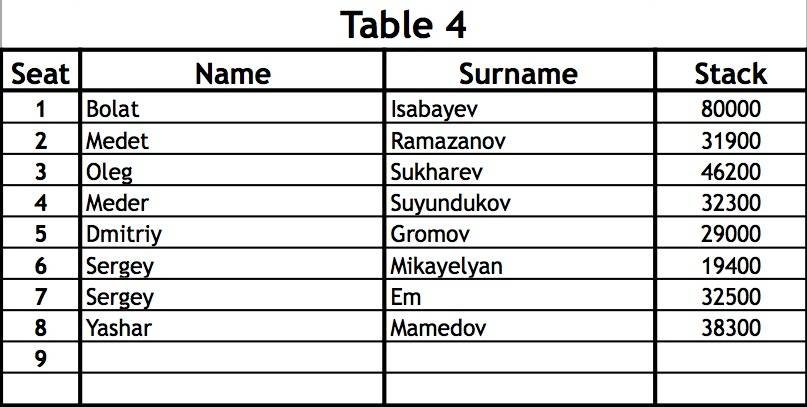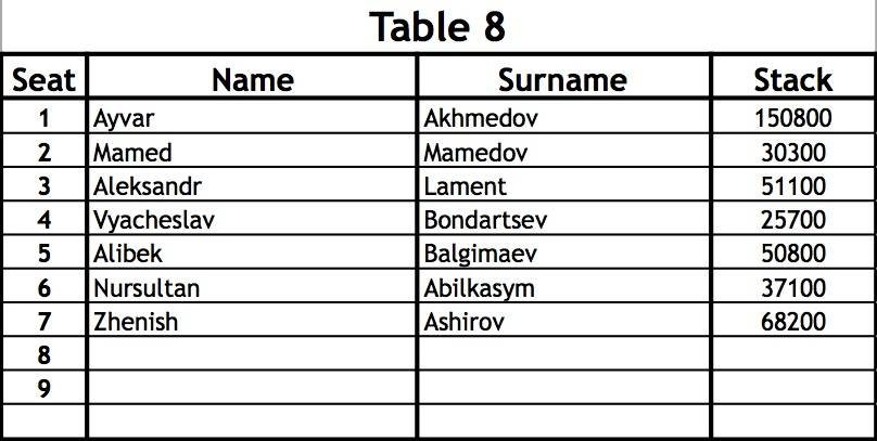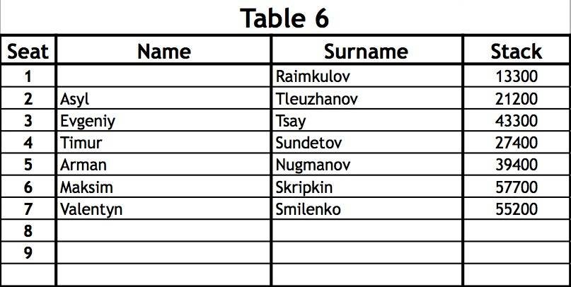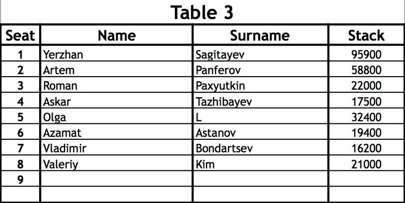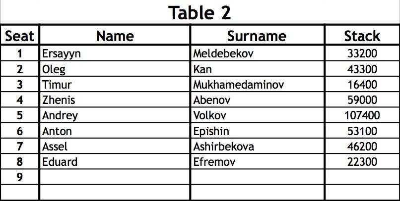 А между тем прошел второй стартовый день 1В Kazakhstan Poker Championship с бай-ином $400 и гарантией в $60,000. В первые минуты турнира было сделано 33 входа, а к завершению дня их число возросло до 61.