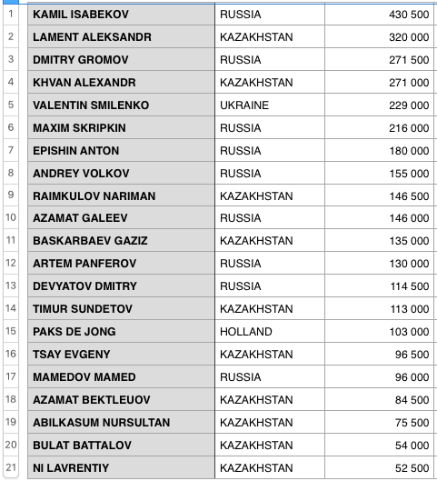Чиплидером турнира является игрок из России Камиль Исабеков, который накопил в стеке 430,500 фишек. Напомним, Камиль в прошлом году здесь же, в казино «Бомбей», стал чемпион майской серии, выиграв Главный турнир World Poker Tour National Kazakhstan.