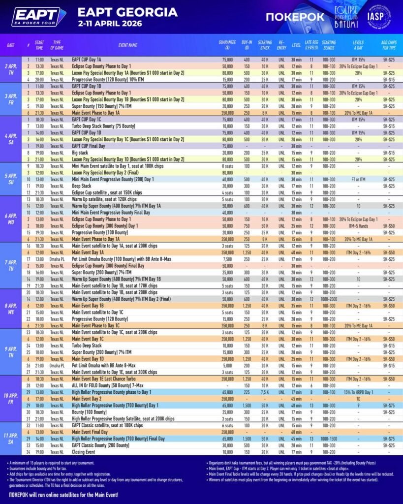 EAPT Georgia с гарантией $1,000,000 пройдет 2-11 апреля в Батуми в казино Eclipse. Серия состоится без рейка, а отобраться можно через онлайн-сателлиты на ПОКЕРОК.
