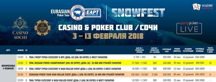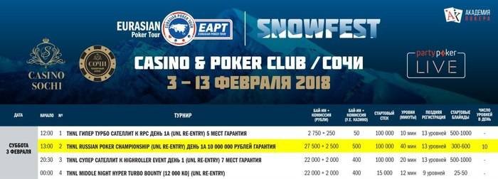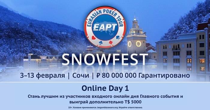 Как вы знаете, участие в EAPT Snowfest можно начать у себя дома. 4-го февраля в 21:00 МСК стартует входной онлайн день Главного события. При удачном стечении обстоятельств вы сможете продолжить игру в День 2, 10-го февраля, уже в “Казино Сочи”.