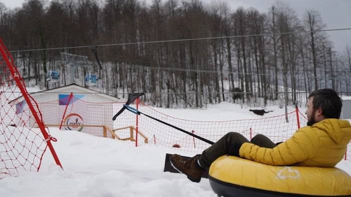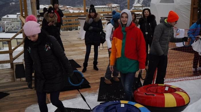 Сегодня мы открыли нашу развлекательную программу большим тюбинговым заездом. Собрались в 10 утра. На удивление проснулось довольно мало народа — всего 20 человек. В сентябре мы собирались огромными компаниями по 60 человек. Видимо, летние развлечения манят больше зимних)) Если честно, я ожидала, что горки будут круче. И разделение горок на взрослые и детские оказалось довольно условным. Впрочем, все равно было очень весело скатиться несколько раз. А вот те, кто пришел с детьми, по настоящему кайфанули. Потому что дети визжали и катались, а взрослые могли насладиться спокойной жизнью с глинтвейном за столиками с видом на горы.