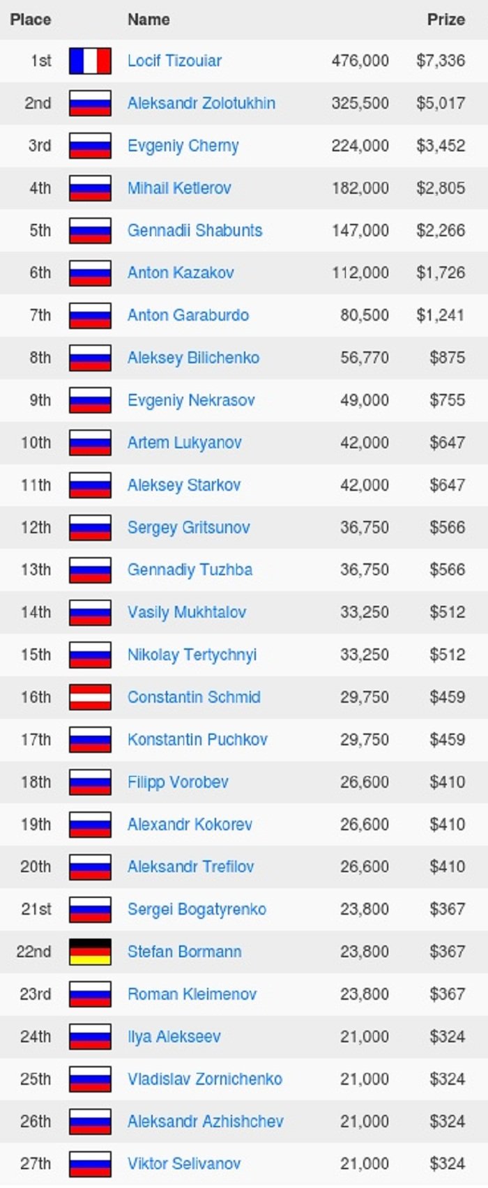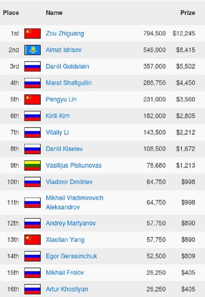 37 Alexsey Kozlov Russia 8 500