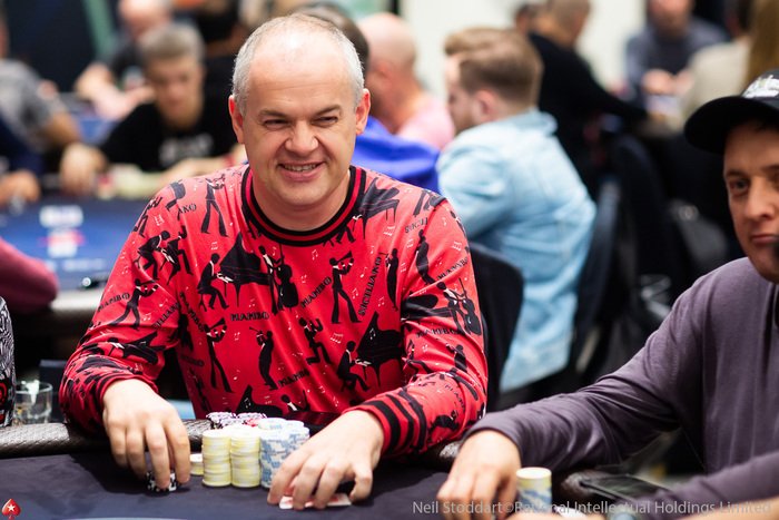Андрей Лукьянов, чиплидер турнира по итогам дня 1А, с баттона ставит олл-ин в 23бб на А-7. Александр Сергутин с малого блайнда сделал кол на 10-10, которые оказались сильнее.