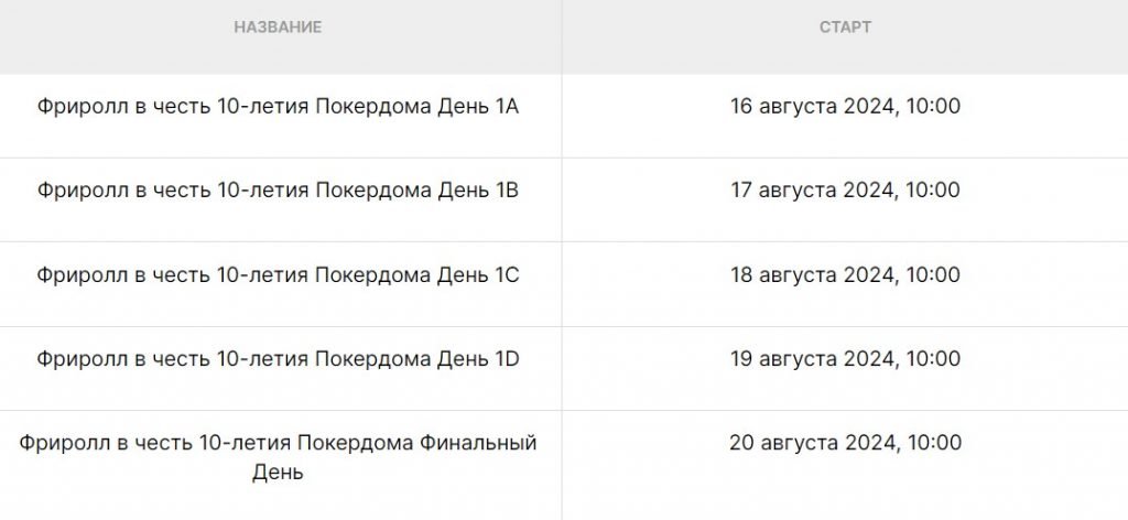 - Время уровней стартовых дней: 20 минут до закрытия регистрации в турнир, 15 минут после закрытия регистрации в турнир.