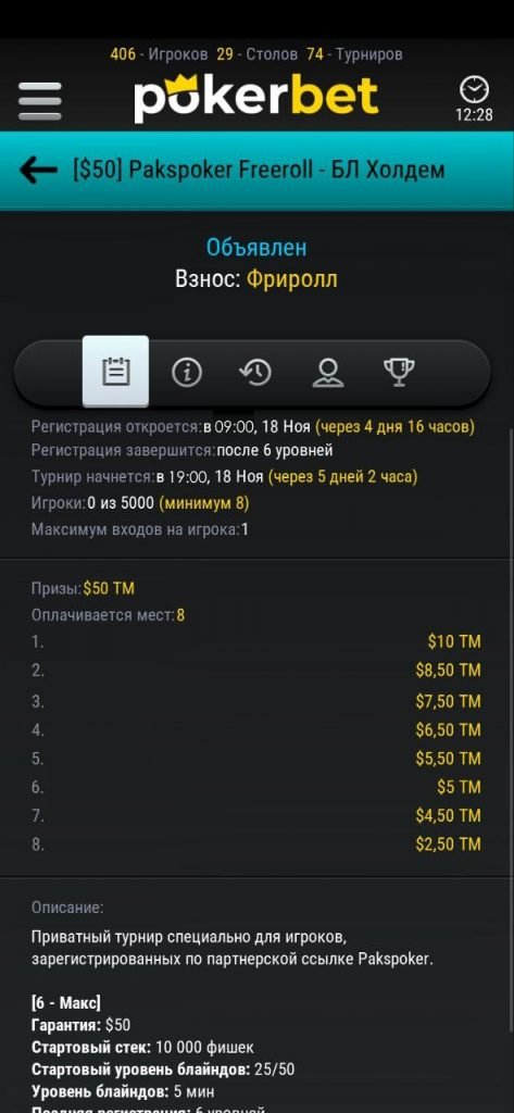 Каждую субботу Pokerbet проводит бесплатный турнир (Pakspoker Freeroll) для игроков из Казахстана с гарантией $50.