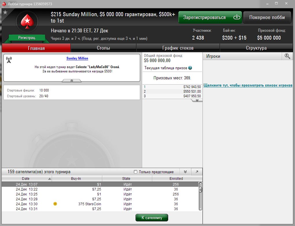 Как всегда покер-рум приготовил для своих клиентов грандиозную акцию с различными предложениями. Ещё два дня предлагается выполнить задания Новогоднего календаря (сегодня играйте в сит-энд-гоу, спин-энд-гоу и кеш и получайте различные призы), а 27 декабря пройдет крупнейший еженедельный турнир в мире онлайн-покера — Sunday Million. Но в честь праздников его гарантия составит минимум $5,000,000, а победитель получит не менее $500,000! Начало турнира в 01:30 АЛА. У кого нет возможности зарегистрироваться в турнир напрямую, заплатив бай-ин в $215, то можно отобраться через многочисленные сателлиты, в том числе и за очки.