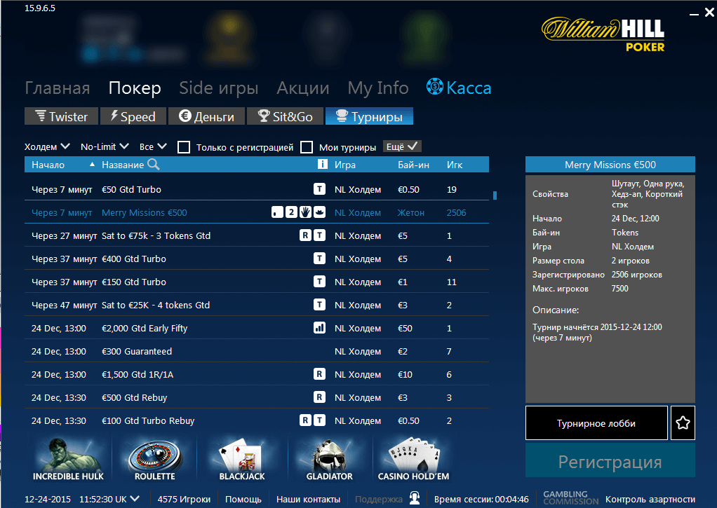 Вы получите: 1 билет на “Merry Missions €10K”, который пройдет 27.12.2015. Формат турнира «Аll in 1-hand» — игроки будут вынуждены играть на все фишки в каждой раздаче.