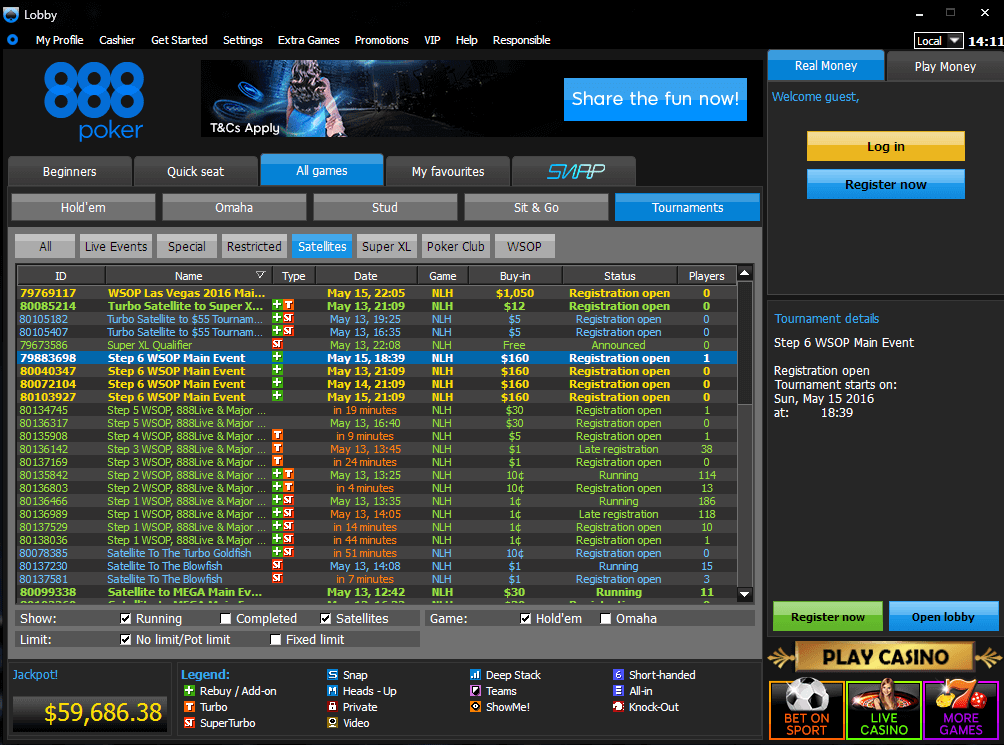 888Poker, как официальный спонсор WSOP 2016, предлагает самый большой выбор сателлитов, в которых разыгрываются пакеты на Главный турнир Мировой серии. Турниры стартуют всего от 1 цента.