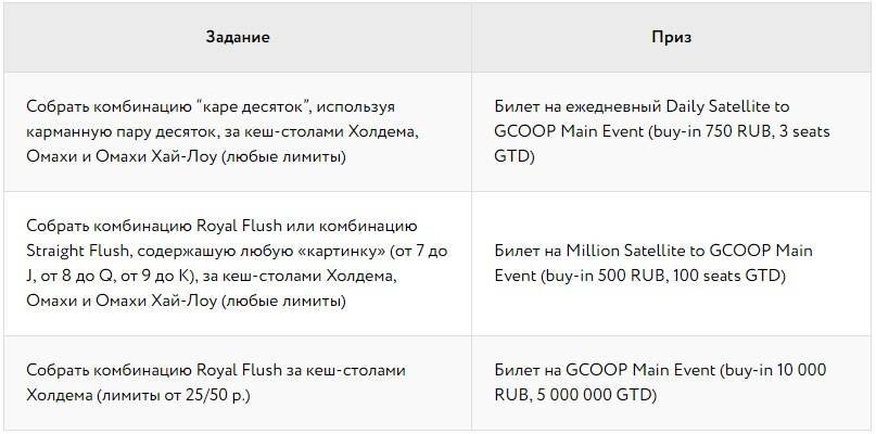 Кроме того, вы сможете отобраться на GCOOP Main Event 5 000 00 RUB GTD бесплатно с помощью трёх специальных заданий.