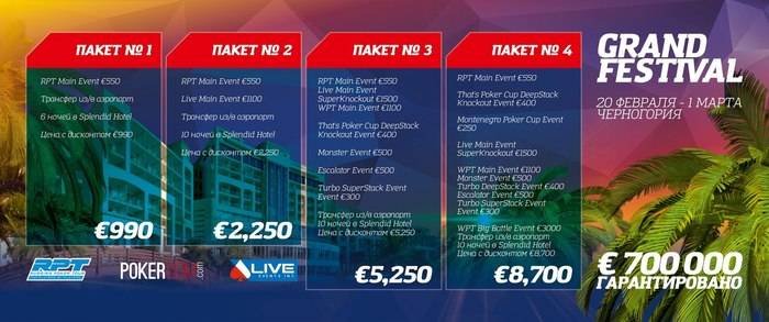 MONTENEGRO POKER CUP €250 (10%) ГАРАНТИЯ €40.000 Стек 10.000, уровни по 30 и 45 минут. Классический «фризаут» с тремя входными днями и жестким ограничением на количество повторных входов (не более 1 ре-энтри в день). Стеки не объединяются. Учитывая огромную популярность данного формата в Европе, а также гарантию в 40.000 евро, мы ожидаем внушительную итоговую цифру в графе «количество участников». Принимая во внимание возможный ажиотаж, предварительная регистрация на данный турнир будет открыта за неделю до начала серии.