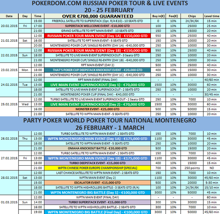 Наши партнеры из PokerDom.com решили гарантировать не менее 50 билетов на главное событие RPT в онлайн сателлитах, отличная возможность попасть на RPT не упустите его. Структура и расписание сателлитов.