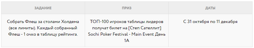 А вот участники акции “Большой куш” получат билеты на [Финальный Сателлит] Sochi Poker Festival — Main Event День 1A и смогут использовать его в любое воскресенье (с 8 ноября по 13 декабря): топ-50 рейк гонки по Холдему, топ-35 по Омахе и топ-15 по Китайскому покеру.