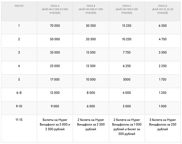 Условия не меняются — играйте за выбранными столами в Hyper Виндфоллах Холдема 3-макс, получайте баллы за сгенерированный рейк из расчёта 1 рубль=1 балл. По итогам гонки будет определен Топ-15 в четырёх лигах, а его участники заберут привлекательные призы, с которыми можно ознакомиться в таблице ниже.