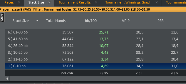 Начну, пожалуй, с планов на будущие. Не на следующий месяц, а до конца года. Я раньше не строил никаких больше чем на месяц вперед, так они все были бы бессмысленны. Ведь не поиграв какое-то время я не знал что ждёт меня, не знал сколько смогу играть, как эффективно буду играть, не знал динамики игры и пр. Октябрь – катать, катать, и катать мтт В целом месяцем я доволен. Хотя намеченные задачи выполнены, в кассе плюс. Последние дни работаю 11 часов (с 6.00-до19.00 (2часа для питания ), покеру уделяю на работе где-то 7-8 часов(в основном турбины катаю, уже неделю сплю по 2-3 часа в сутки), дома уделяю 13-14 часов в день. Турнирная игра в сентябре сложилось лучше, наконец то отпустил стрик. Последние за 3 месяца сыграно 1404 турнира, ABI-20,91$, рой -15%, ИТМ 16,6% Статус без лишних слов: Обучение. Цели на октябрь.